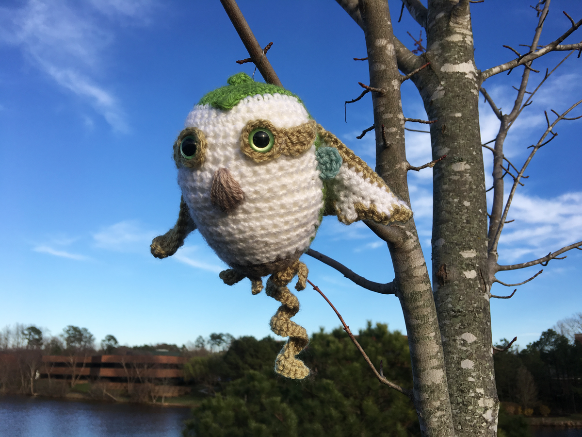 - sew in ends - hold white and fig pieces together, SC around with Fig. (2sc in turns/tips of wings) BO.